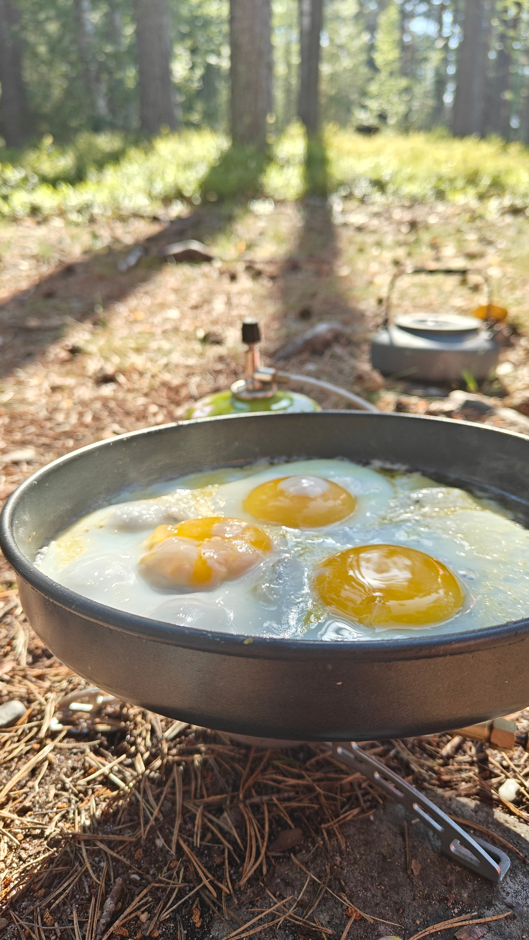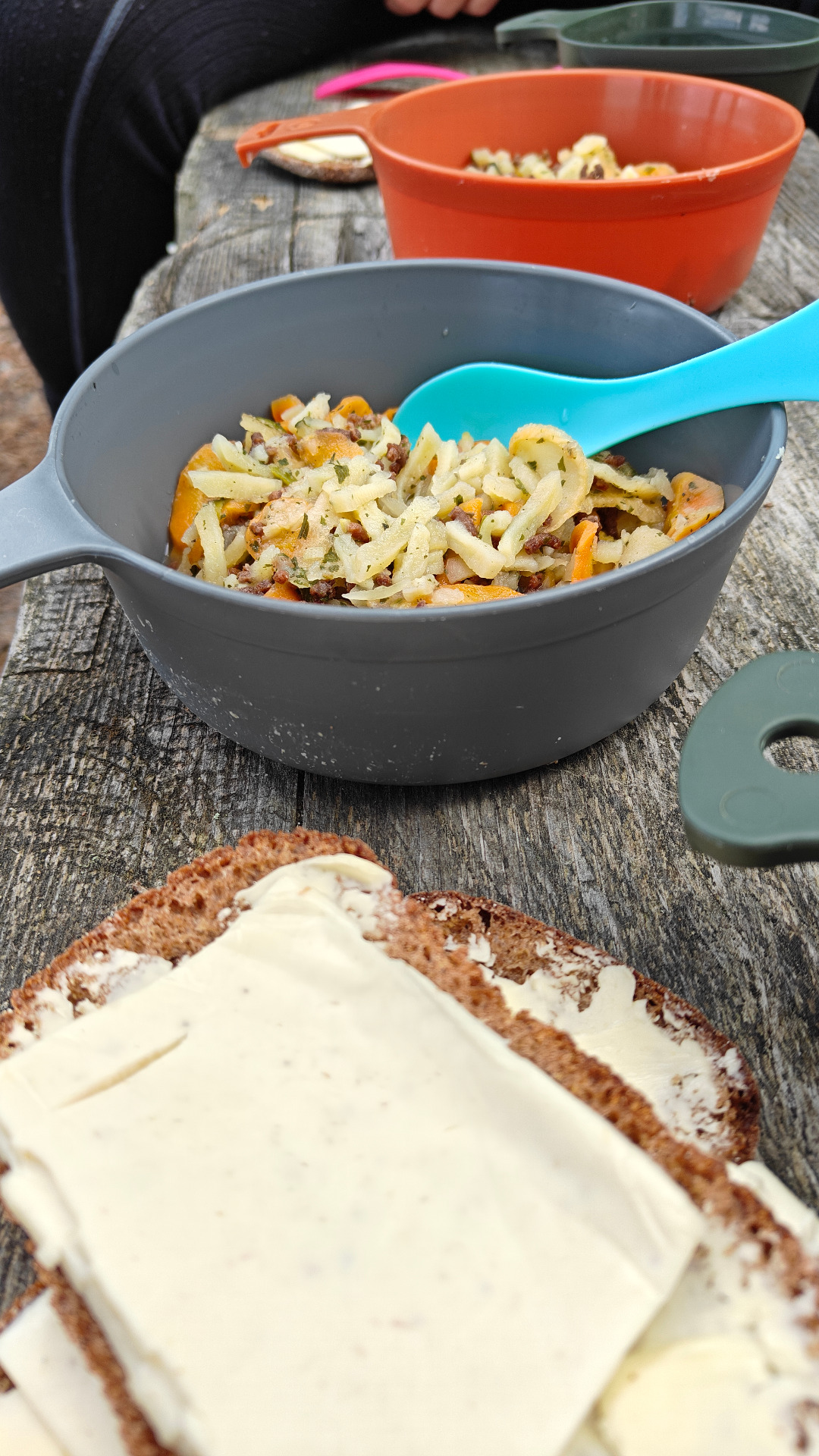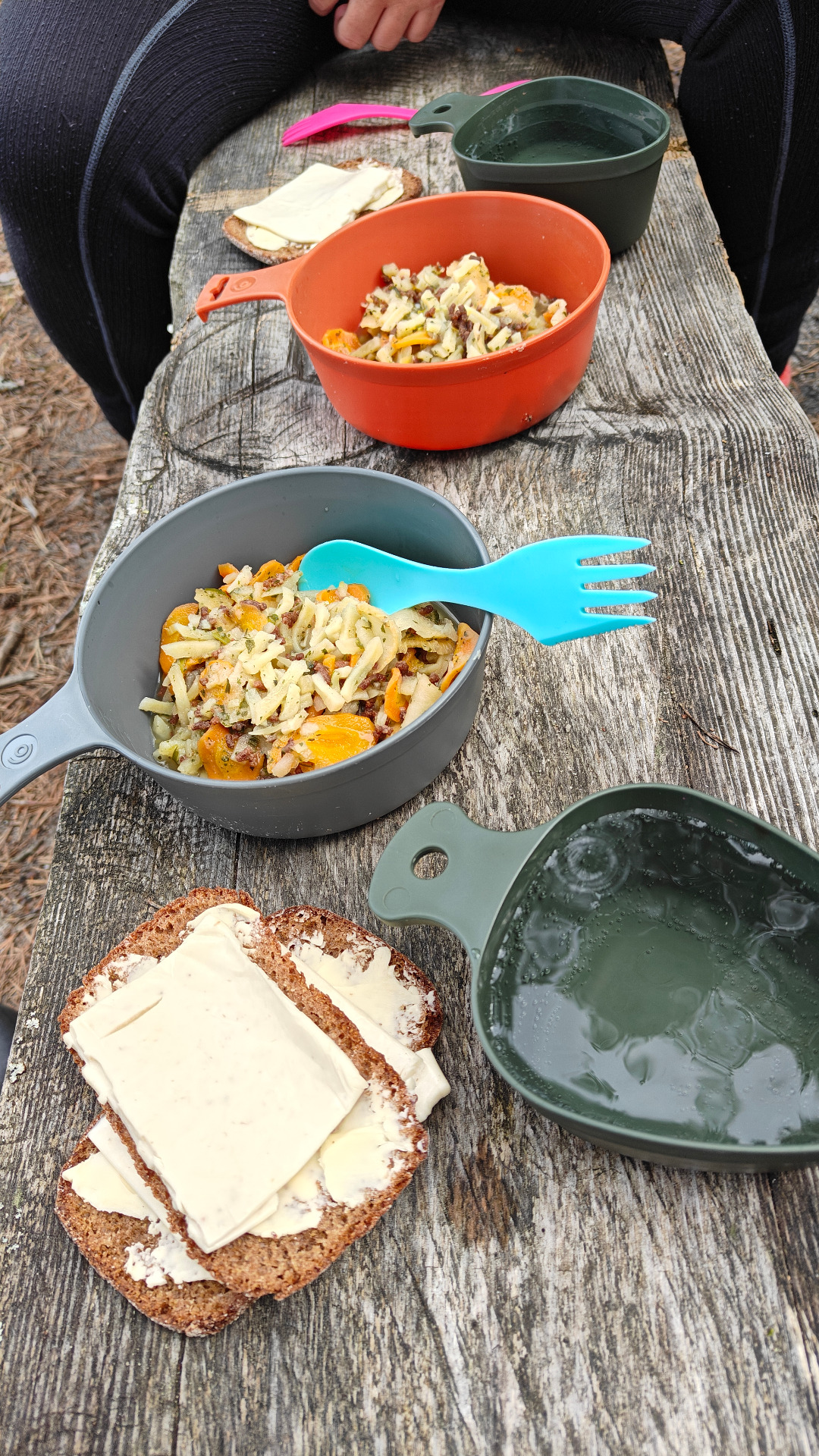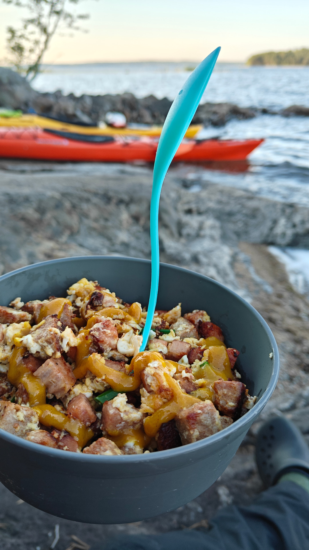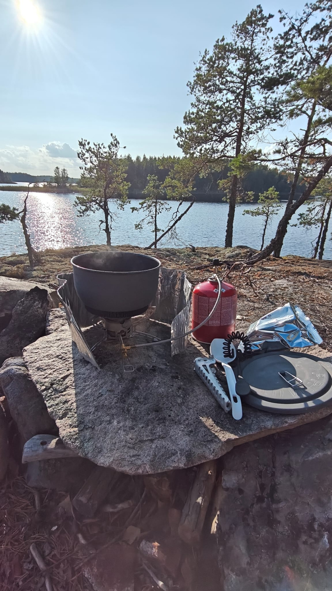 Sateen lakattua aloimme valmistaa päivän ateriaa eli mummon muusia ja pyttipannua. Söimme nälkäisinä ruuan rantakivillä auringonpaisteessa.