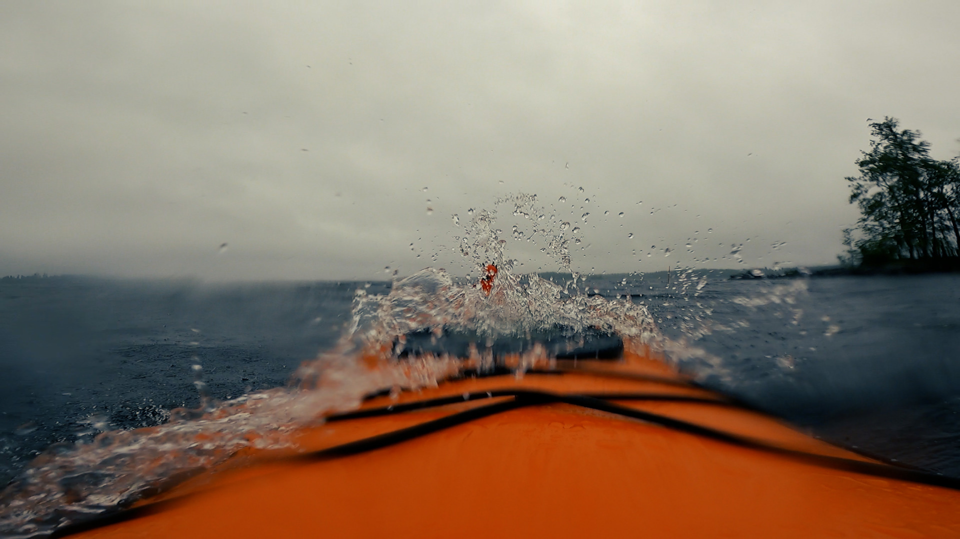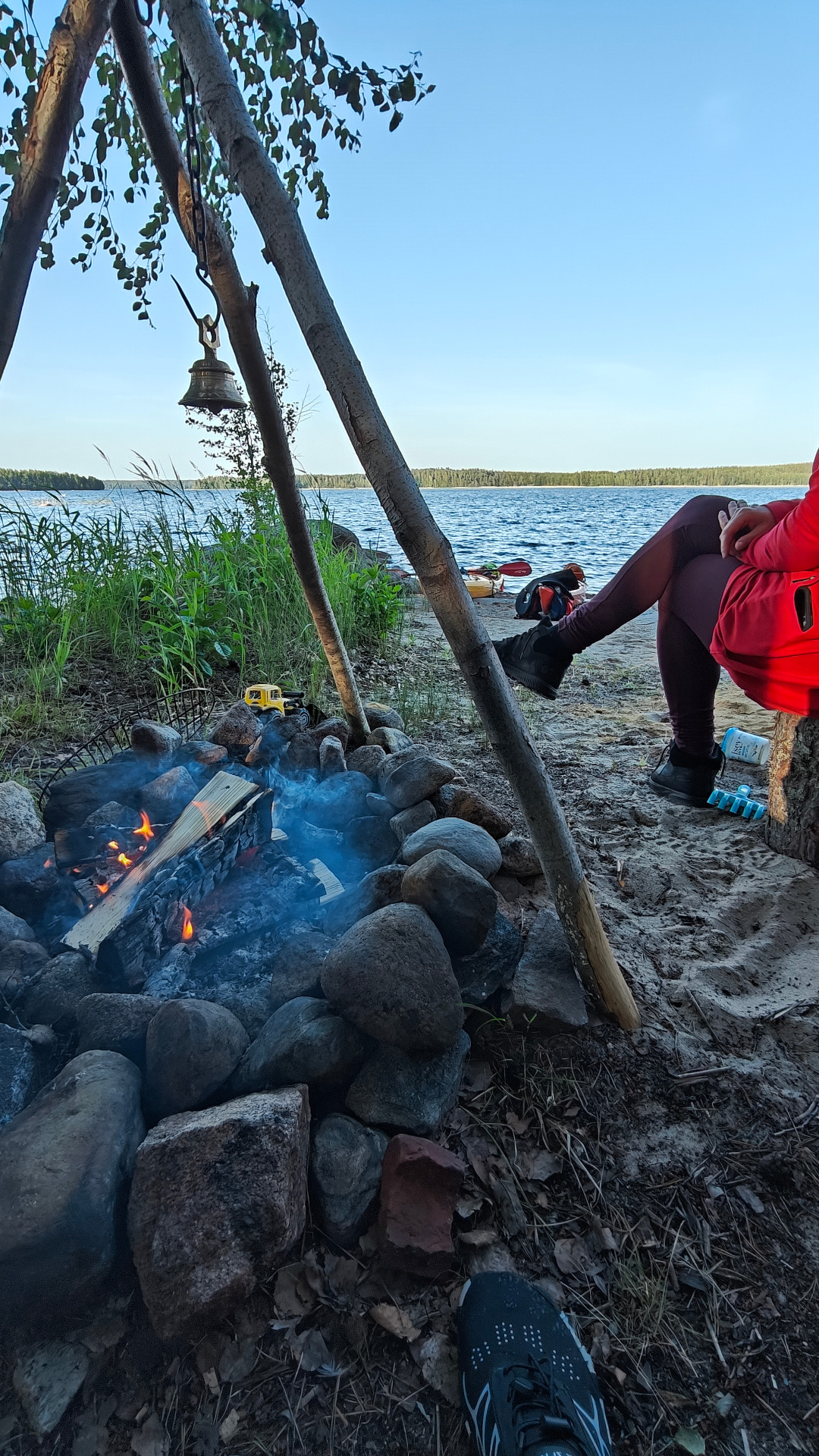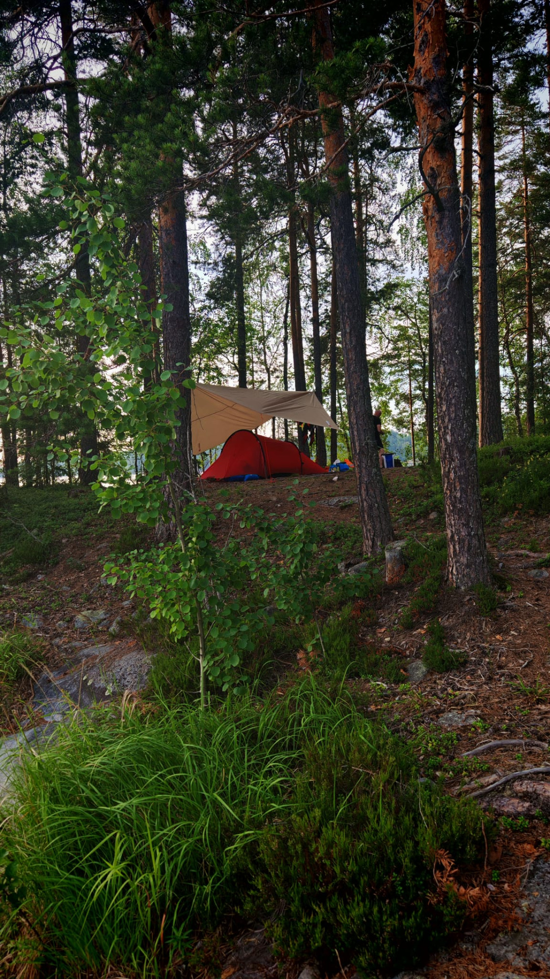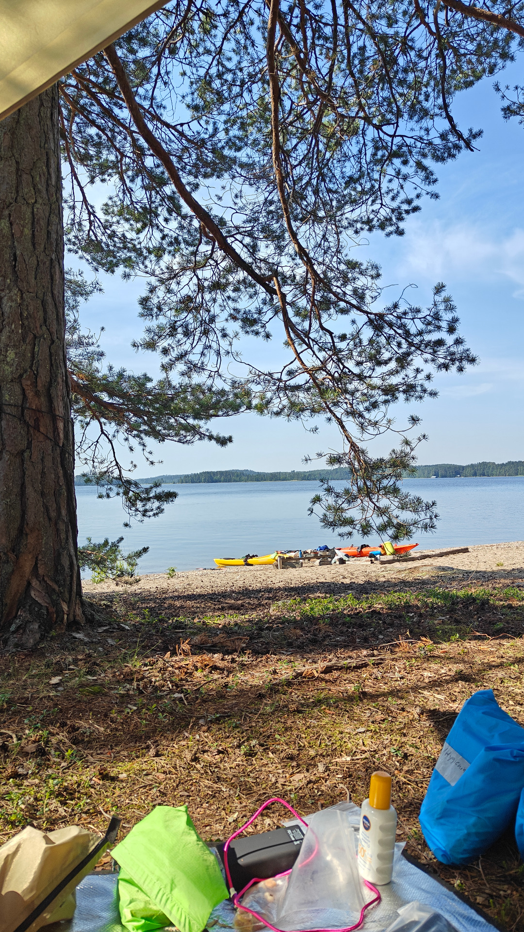 Tuuli yltyi entisestään ja sade piiskasi, vastatuuleen meloen pääsimme läheiseen saareen, vaikka ranta oli kivikkoinen se oli siinä hetkessä turvallisin ratkaisu. Rantautuminen onnistui hyvin, kannoimme tavarat saareen ja pystytimme leirin. Joskus suunnitelmiin on tehtävä muutoksia oman turvallisuuden tähden.