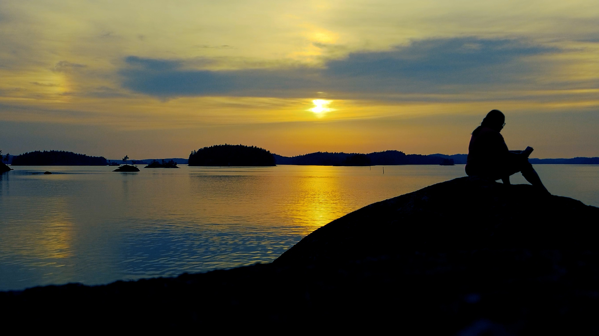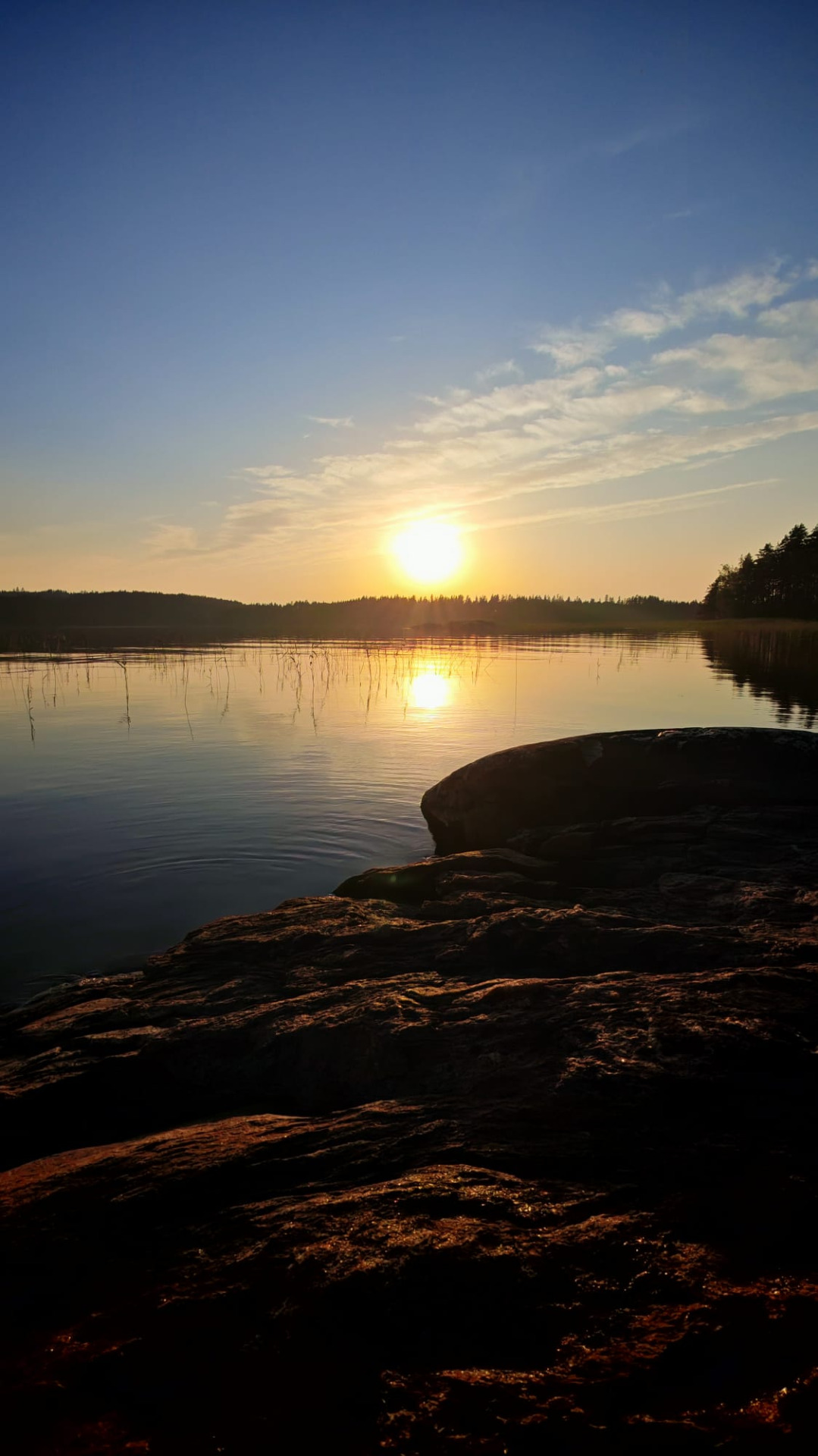 Hampaanpesulla käytiin saaren pohjoispään kalliolla, josta näkyi auringonlasku.