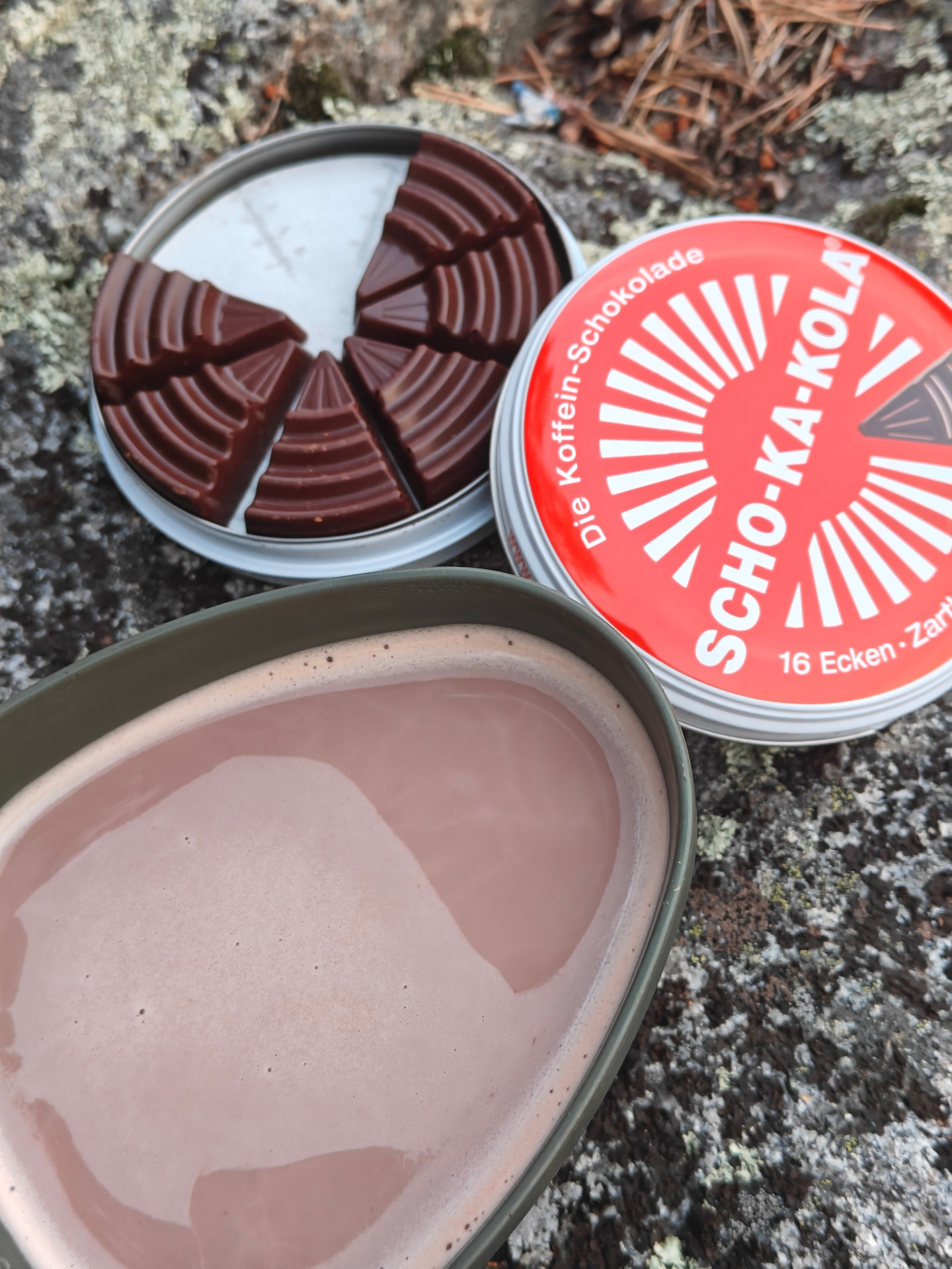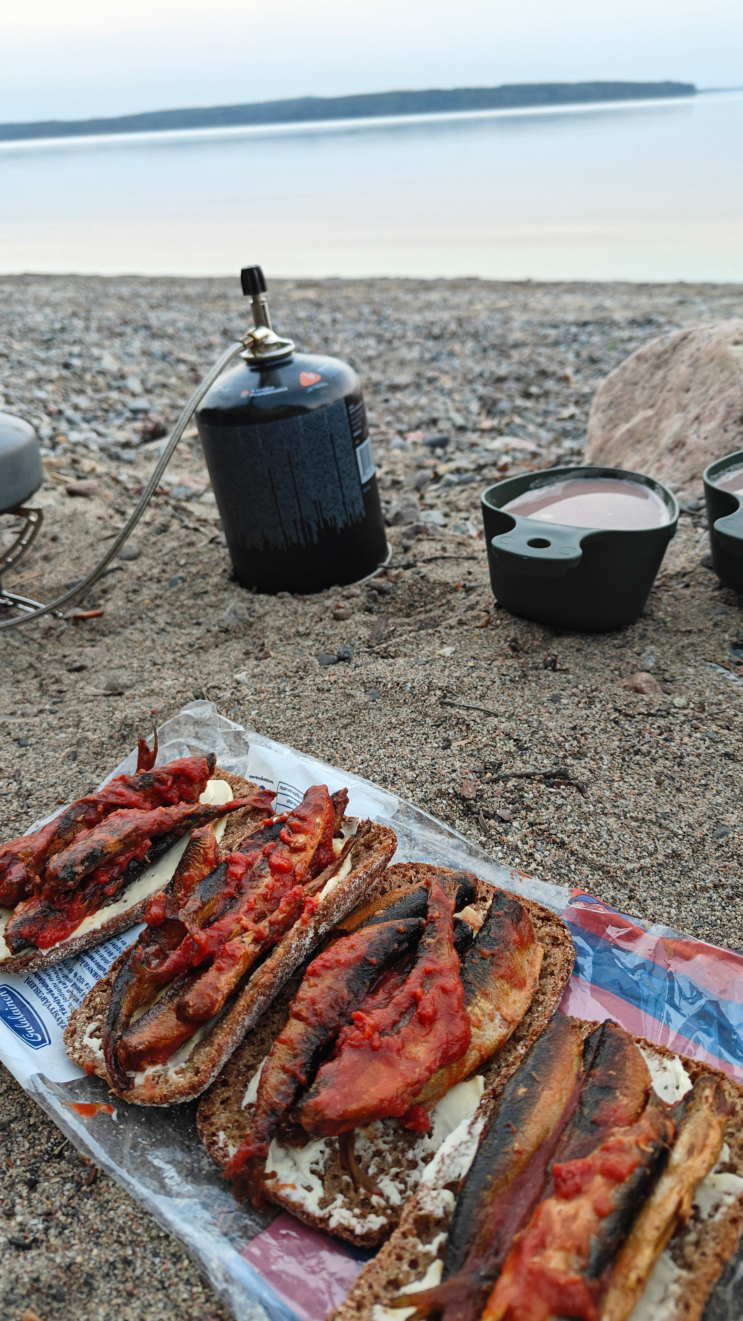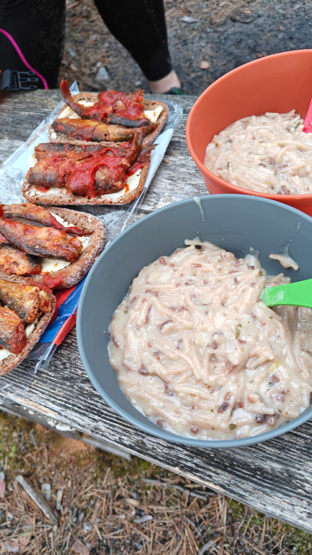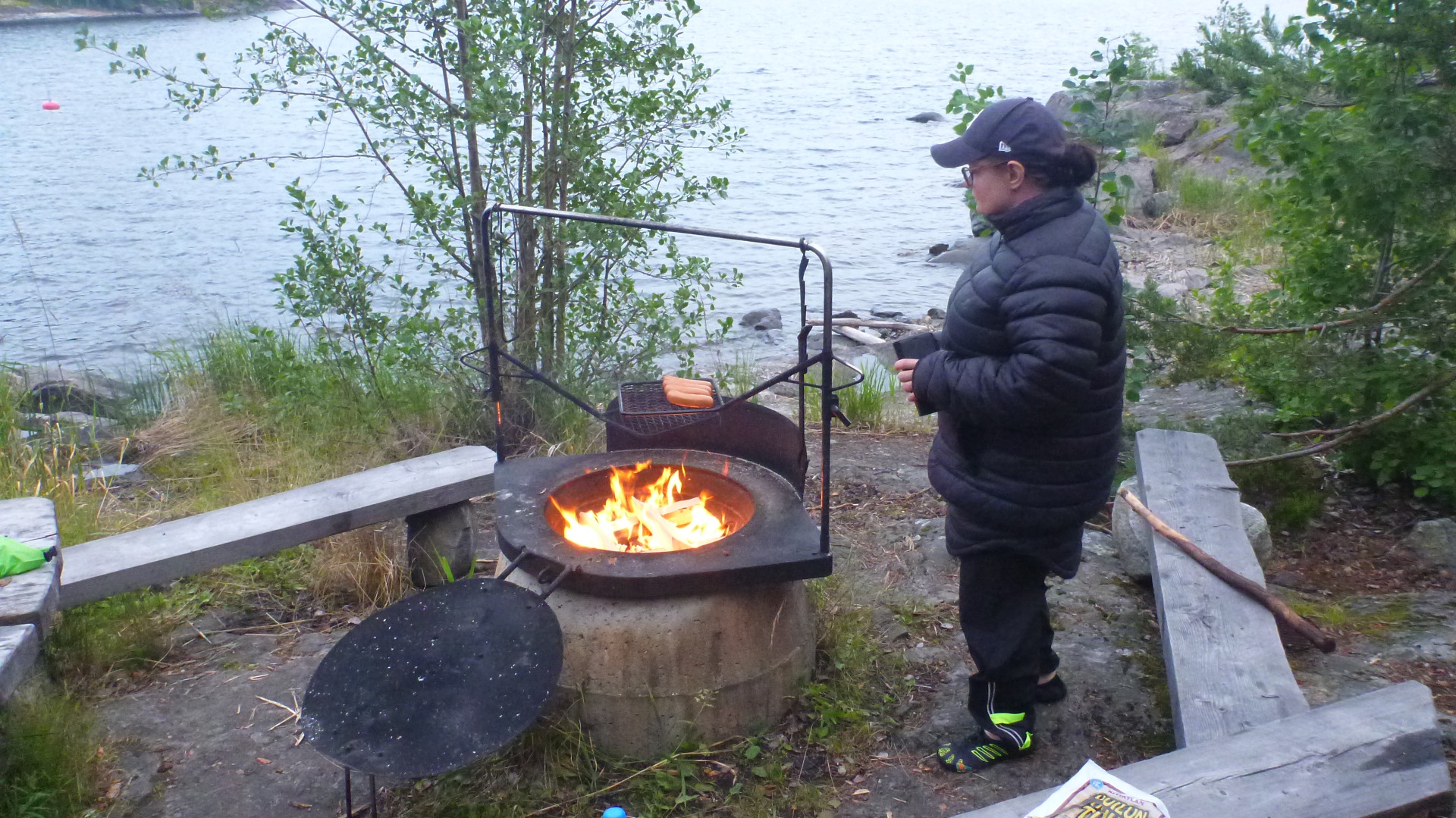 Kylläpä Mummonmuusi ja grillimakkara maistui hyvälle. Nautimme ruuasta ja yhteisestä ajasta luonnonrauhassa. Illalla keittelimme vielä kaakaot ja söimme suklaata istuen kalliolla ja nauttien auringonlaskusta. Lämpimille taukovaatteille olikin heti tarvetta.