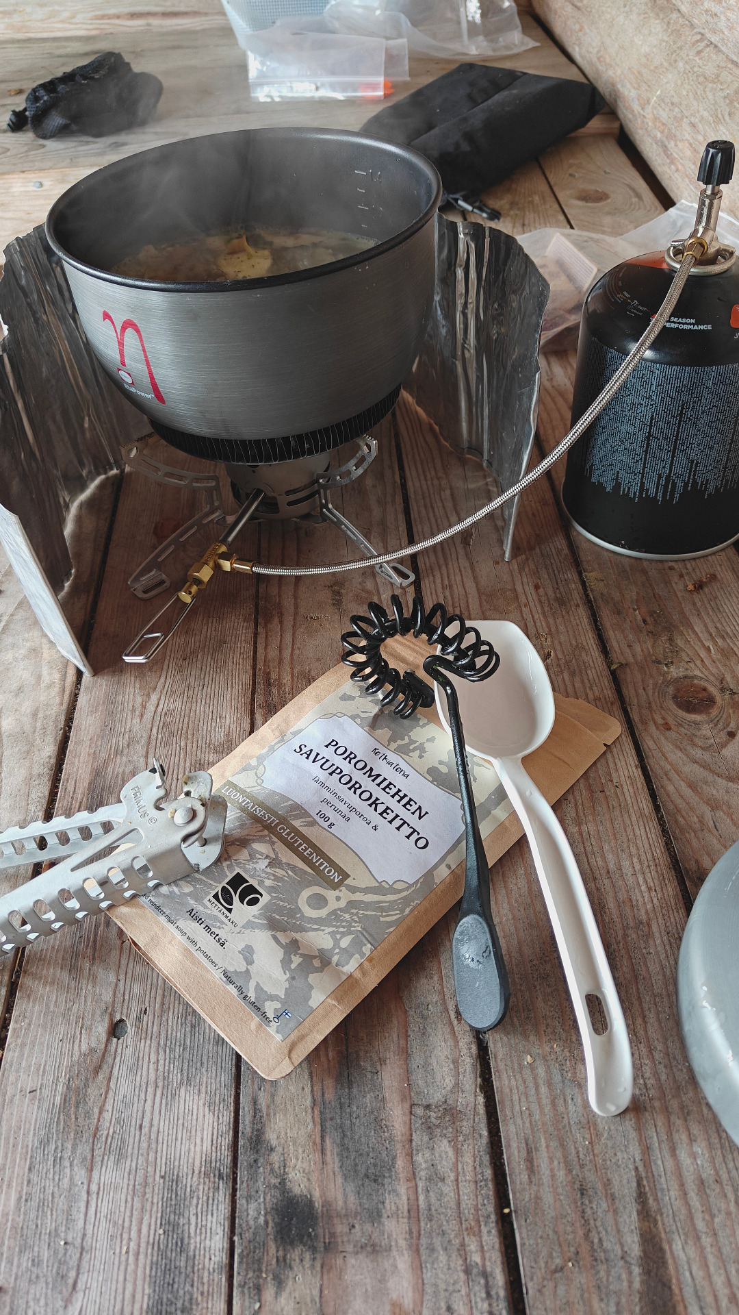 Ruuanlaitossa käytimme retkikeitintä (Primus Omnifuel) koska leiriydyimme myös paikoissa, jotka eivät olleet retkisatamia eikä monessakaan paikassa ole nykyisin polttopuita.