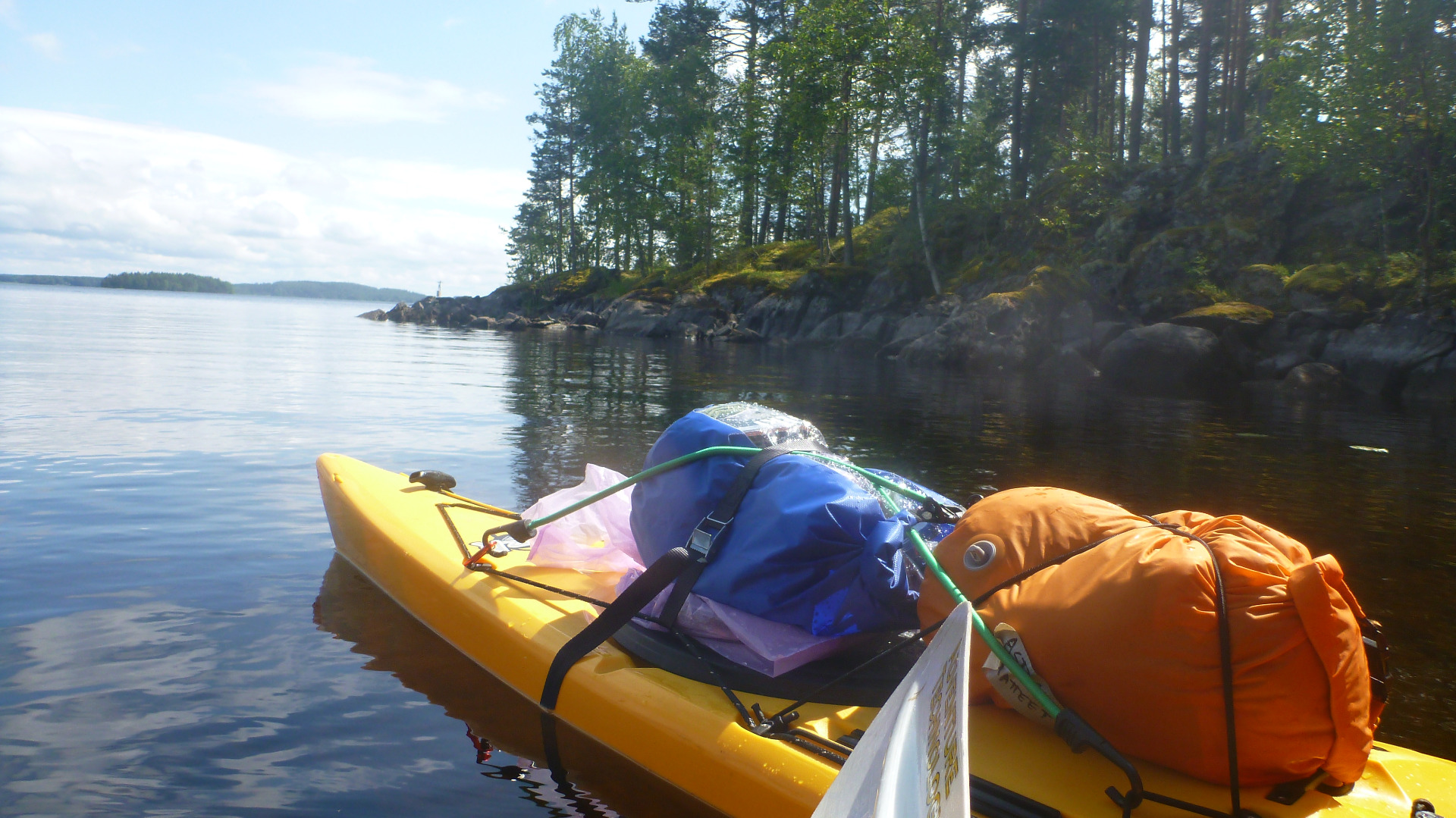 Tavarat olivat pakattu kuivapusseihin, joista toimivimmiksi totesimme 4–10 litran kokoiset, jotka sai parhaiten soviteltua kajakkien tavaratiloihin.